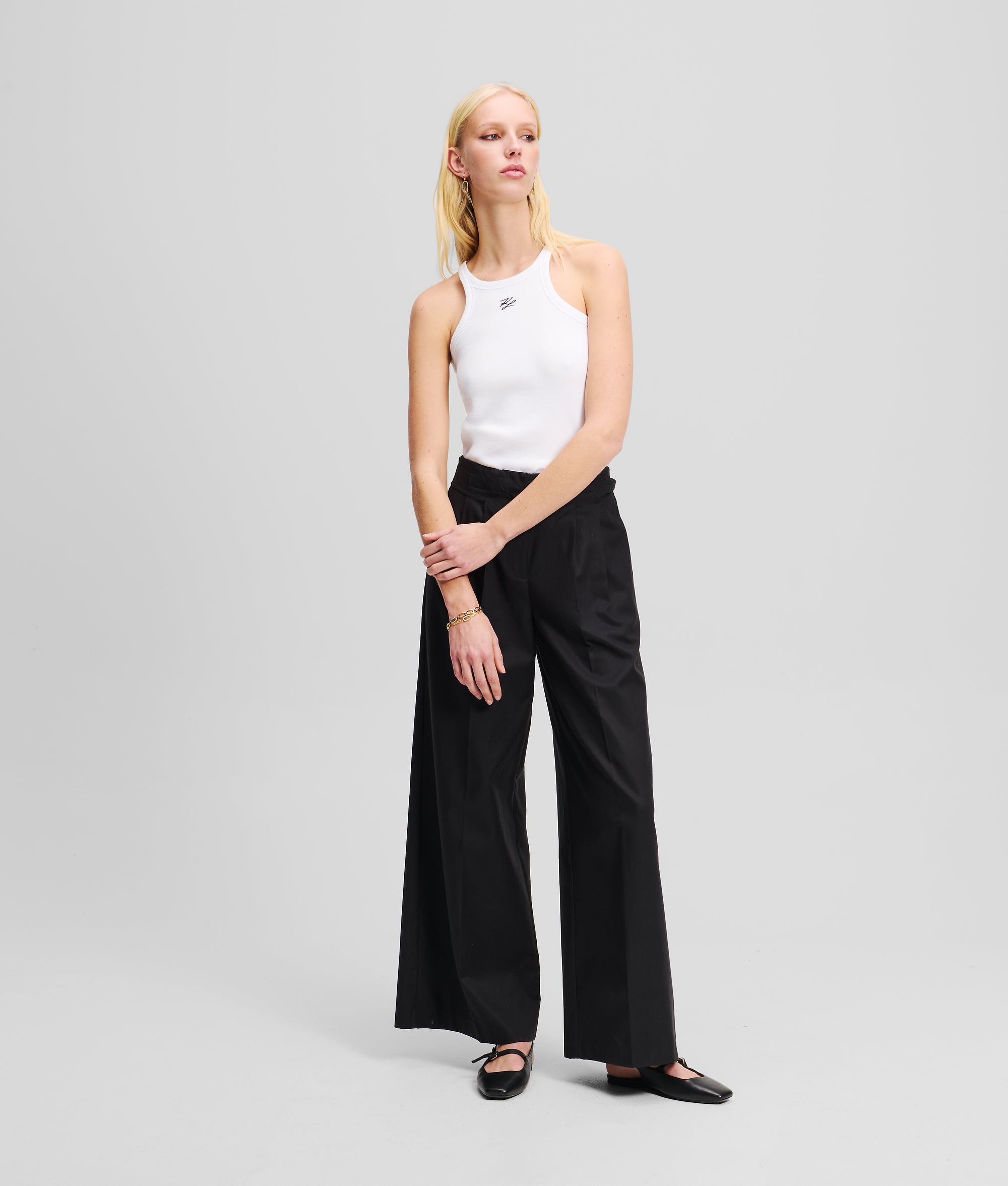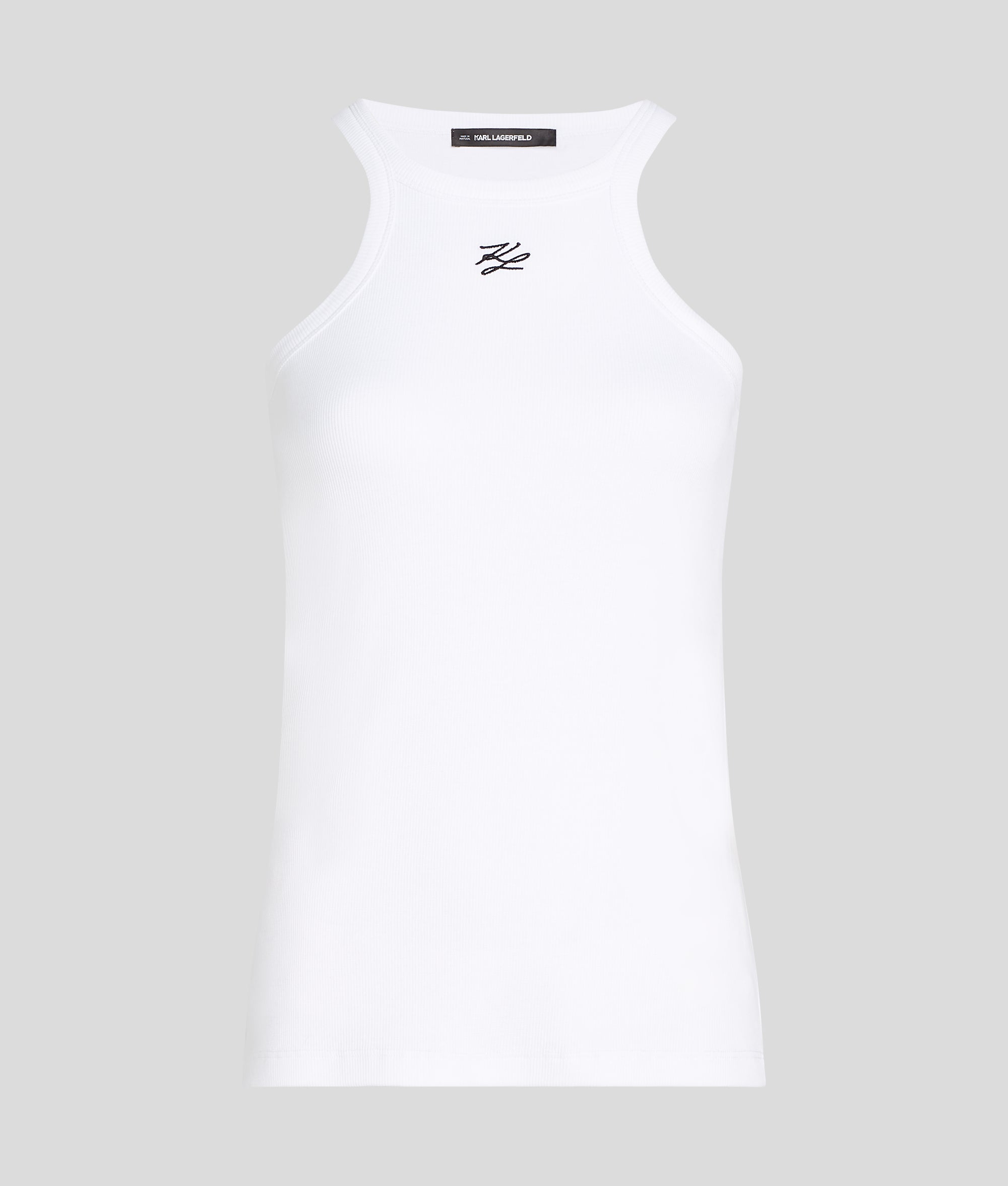 A sleek. figure-hugging silhouette defines this sleeveless racer tank top. featuring KARL Autograph embroidery at the chest. Perfect for effortless layering or standalone style.