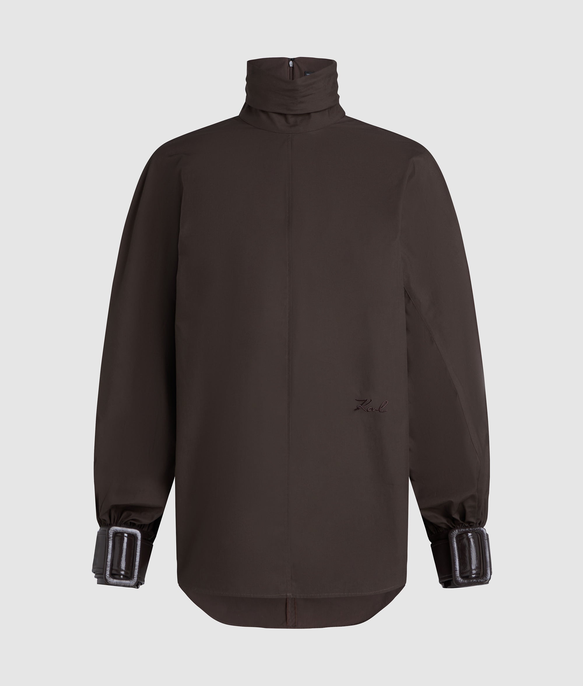 A bold blend of comfort and edge. this blouse features a gathered high collar and oversized kimono sleeves for a relaxed silhouette. High-gloss faux-leather cuffs add a rebellious touch.