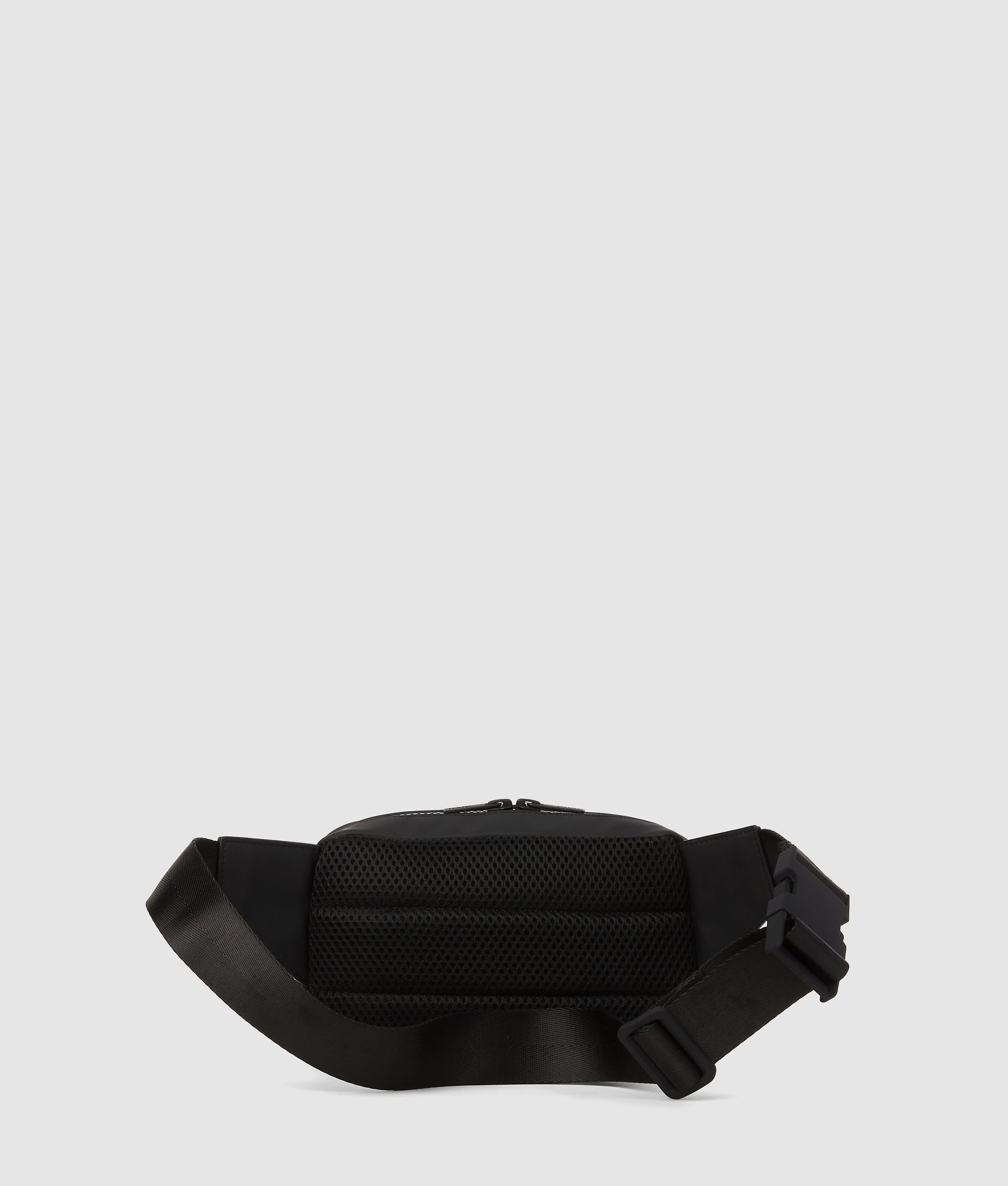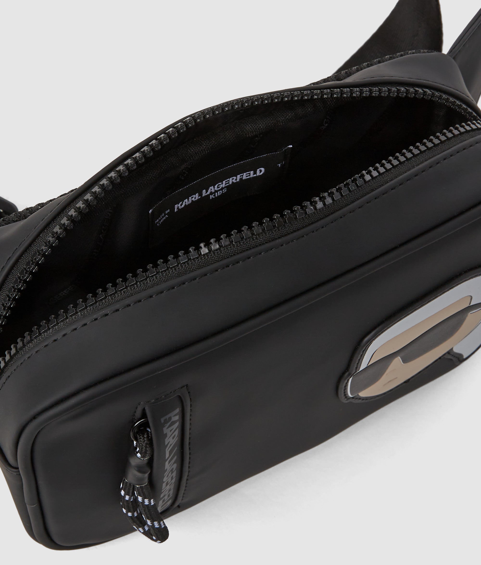 This coated. technical leather belt bag features bold Ikon Karl artwork. dual zip compartments. and an adjustable strap for hands-free days out.