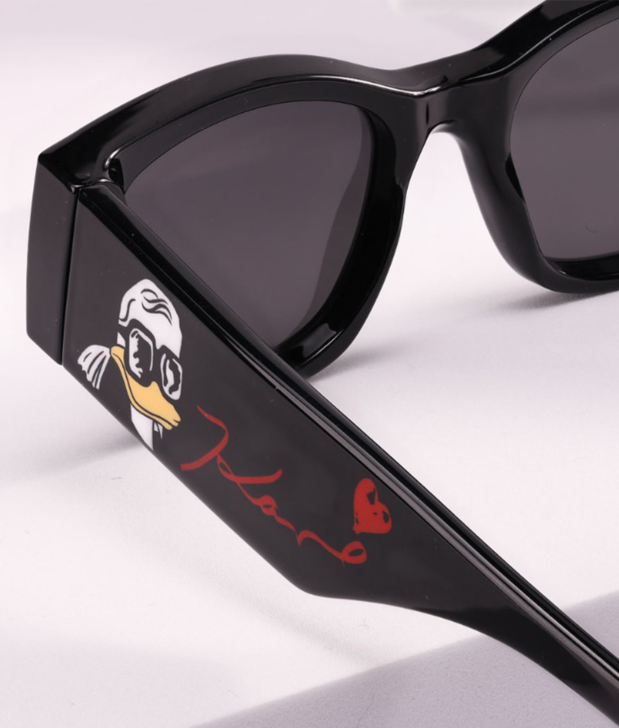 Bring a playful touch to your accessories with these bold sunglasses. part of a limited capsule collection. Deep arms adorned with a playful sketch of Disney’s Donald Duck hand-drawn by Karl Lagerfeld anchor this distinctive piece.