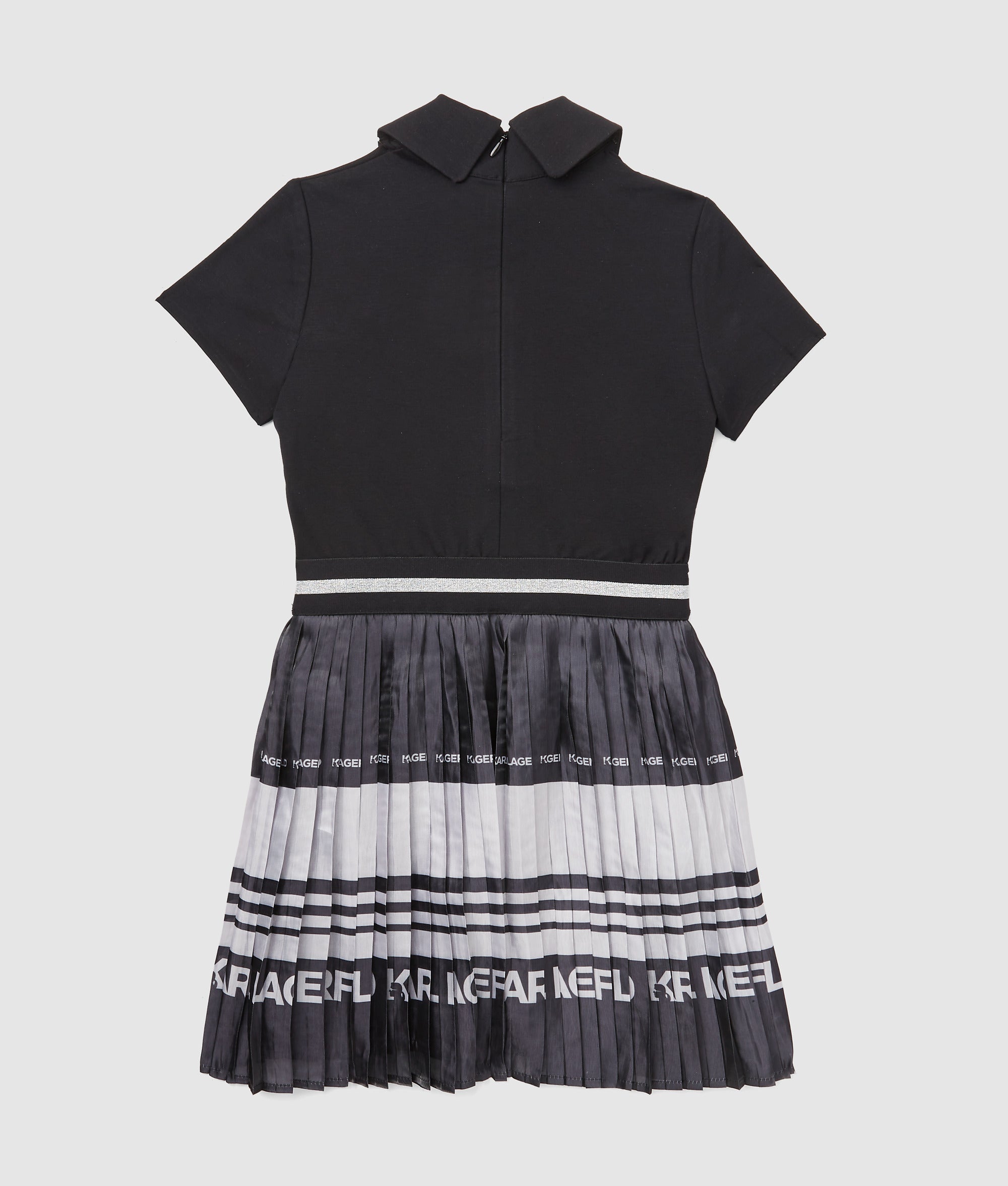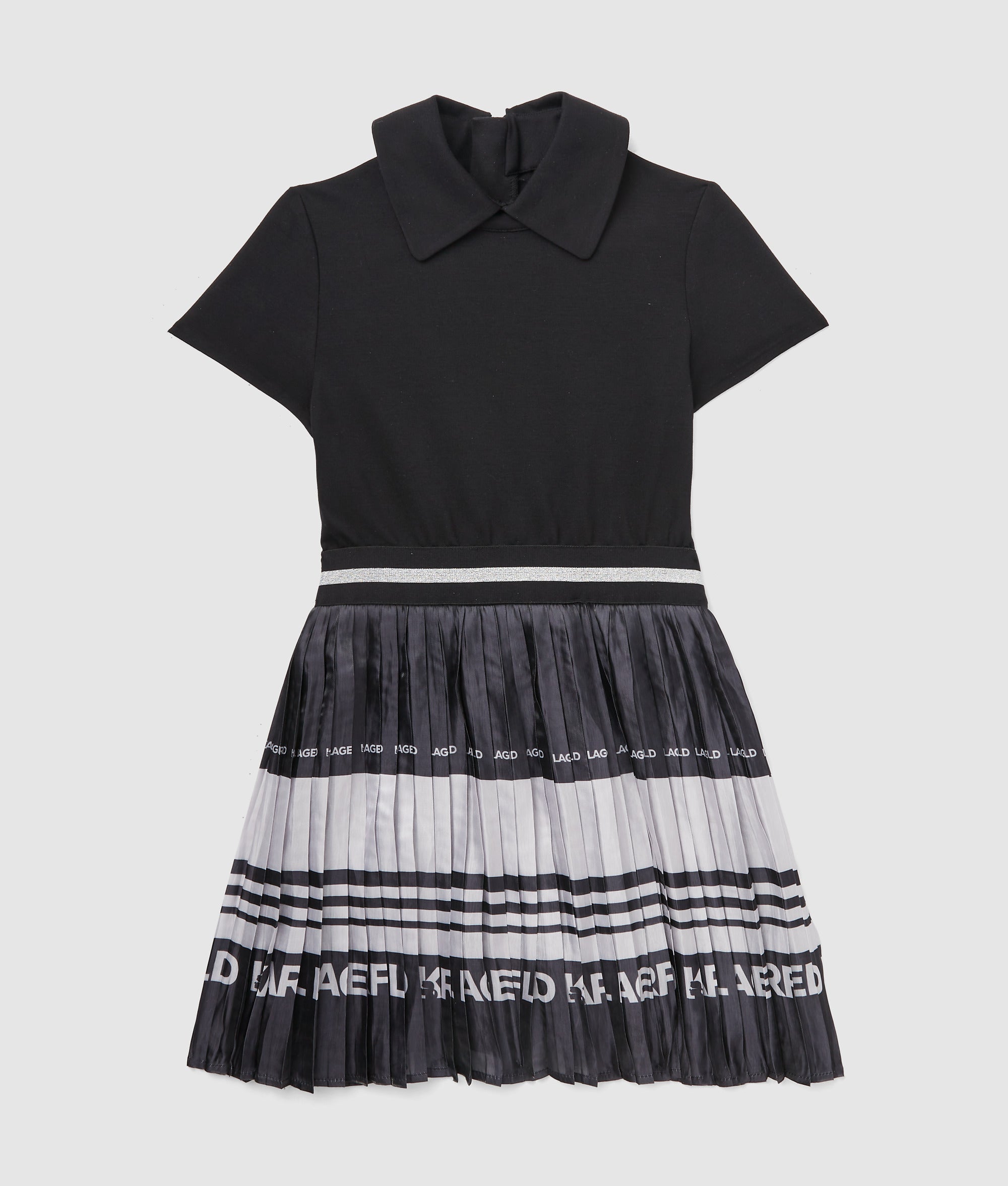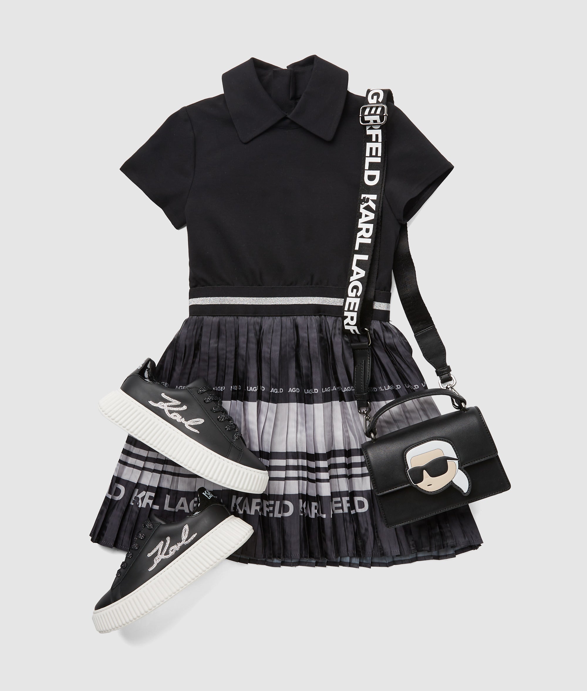 This mixed-material dress blends sporty comfort with polished pleating. The elastic logo waistband adds structure and an unmistakable Karl Lagerfeld finish.