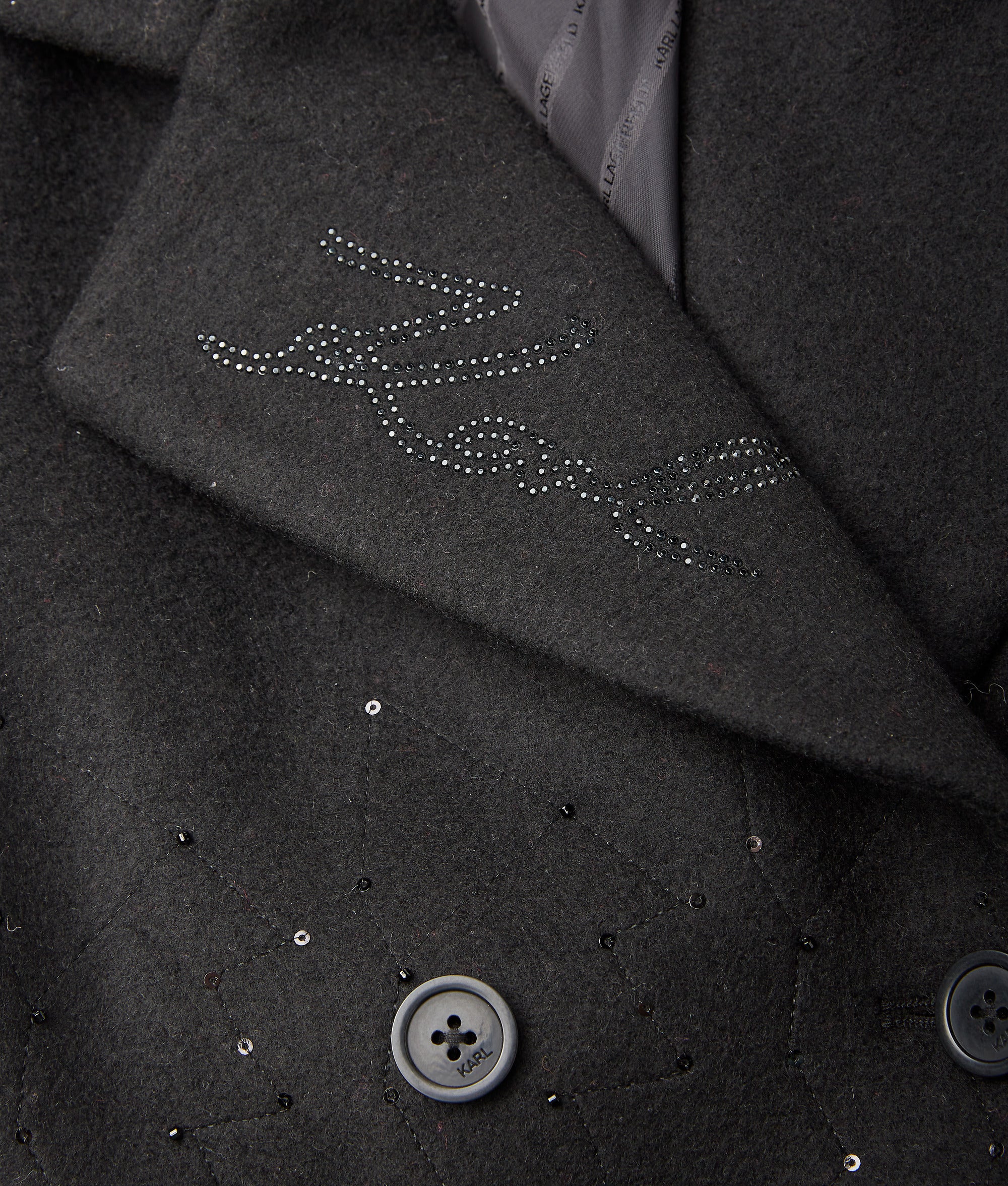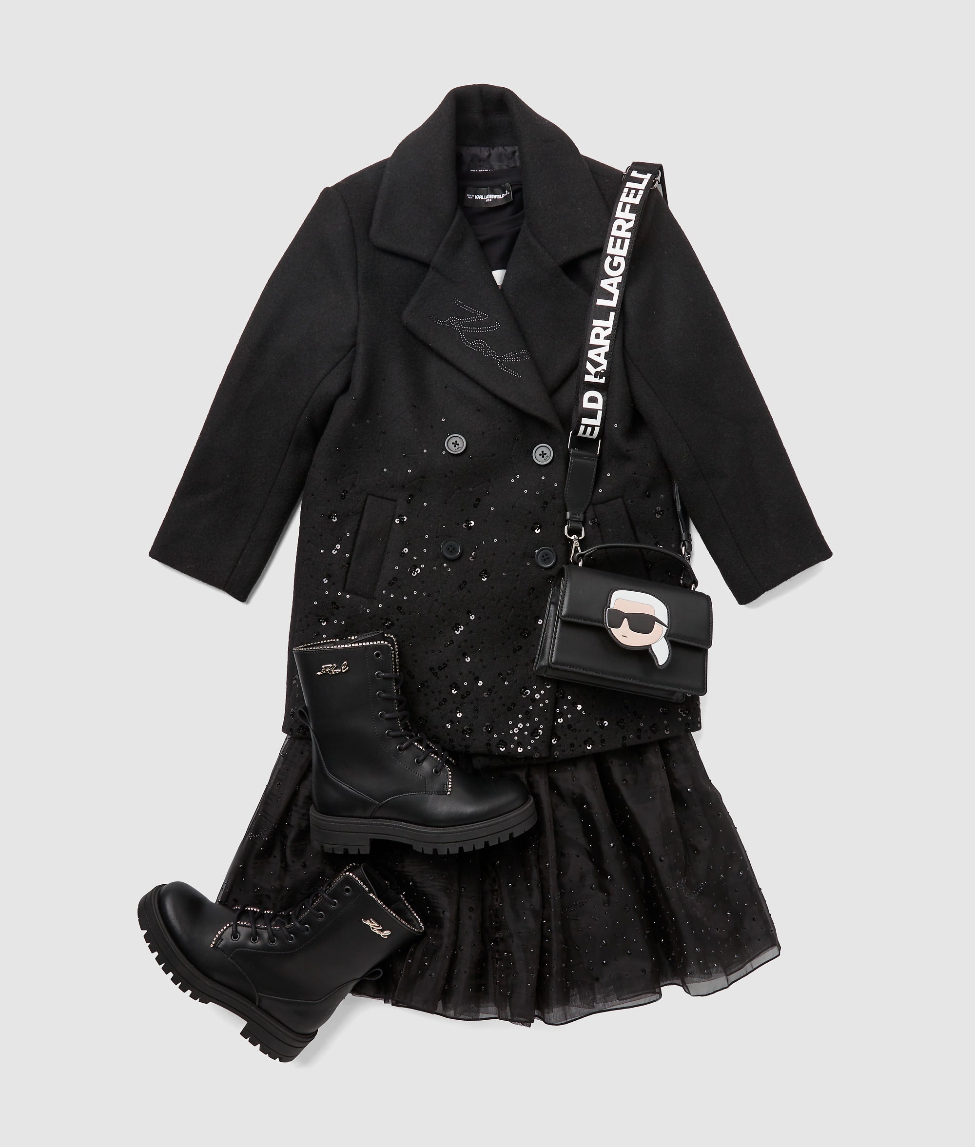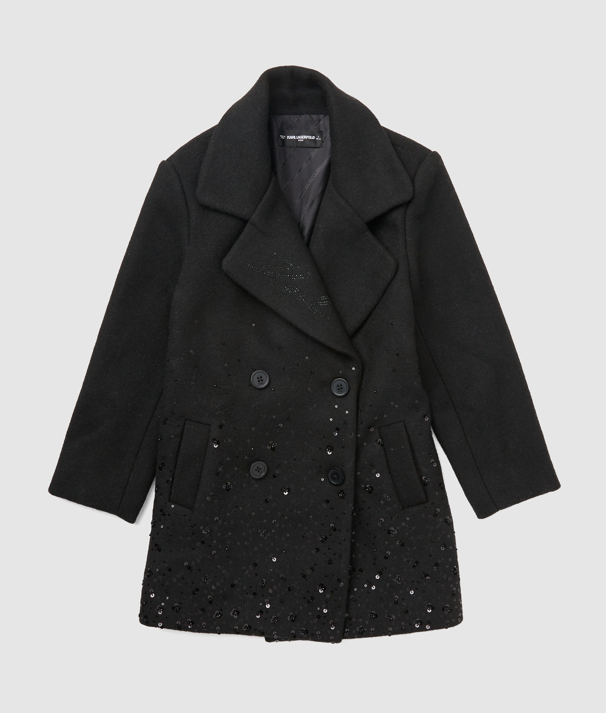 A shimmering double-breasted coat with sparkling details that catch the light. tailored for warmth and style with practical pockets for everyday ease.