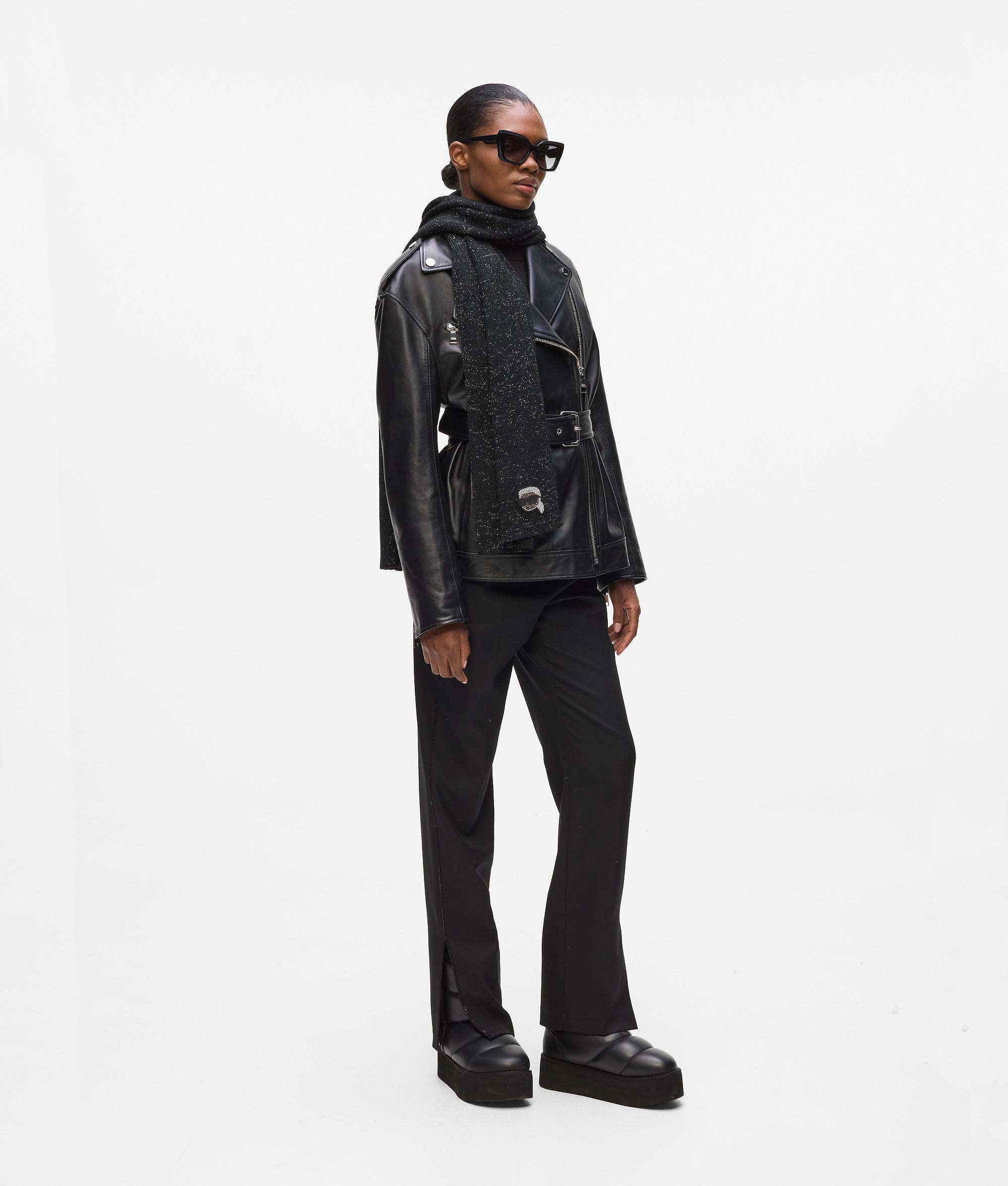 A long-length scarf in a sparkling metallic wool-blend. featuring a metal Ikon Karl pin detail. Style yours with the matching beanie.
