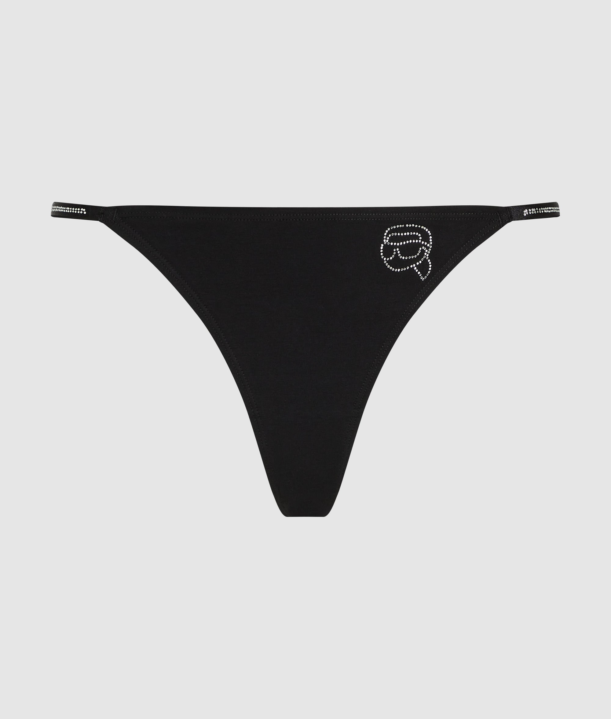 Designed for a sleek silhouette. this thong is cut with high legs and minimal coverage. Rhinestone embellishment at the waist adds sparkle. while Ikon Karl artwork at the hip brings a playful finish. Complete the look with the matching triangle bra.
