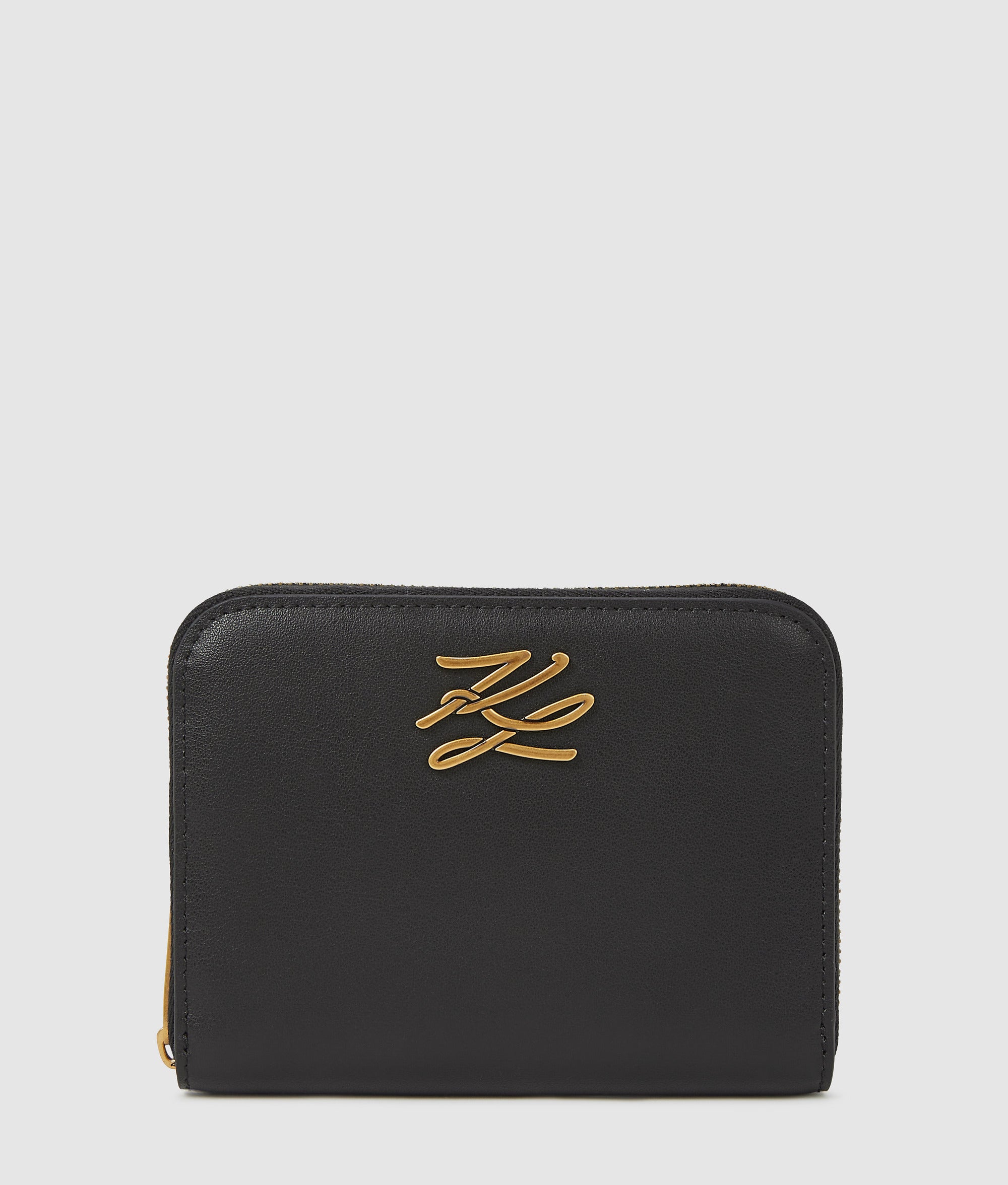 A sleek leather wallet with a secure zip closure and multiple card slots. finished with elegant hardware.?