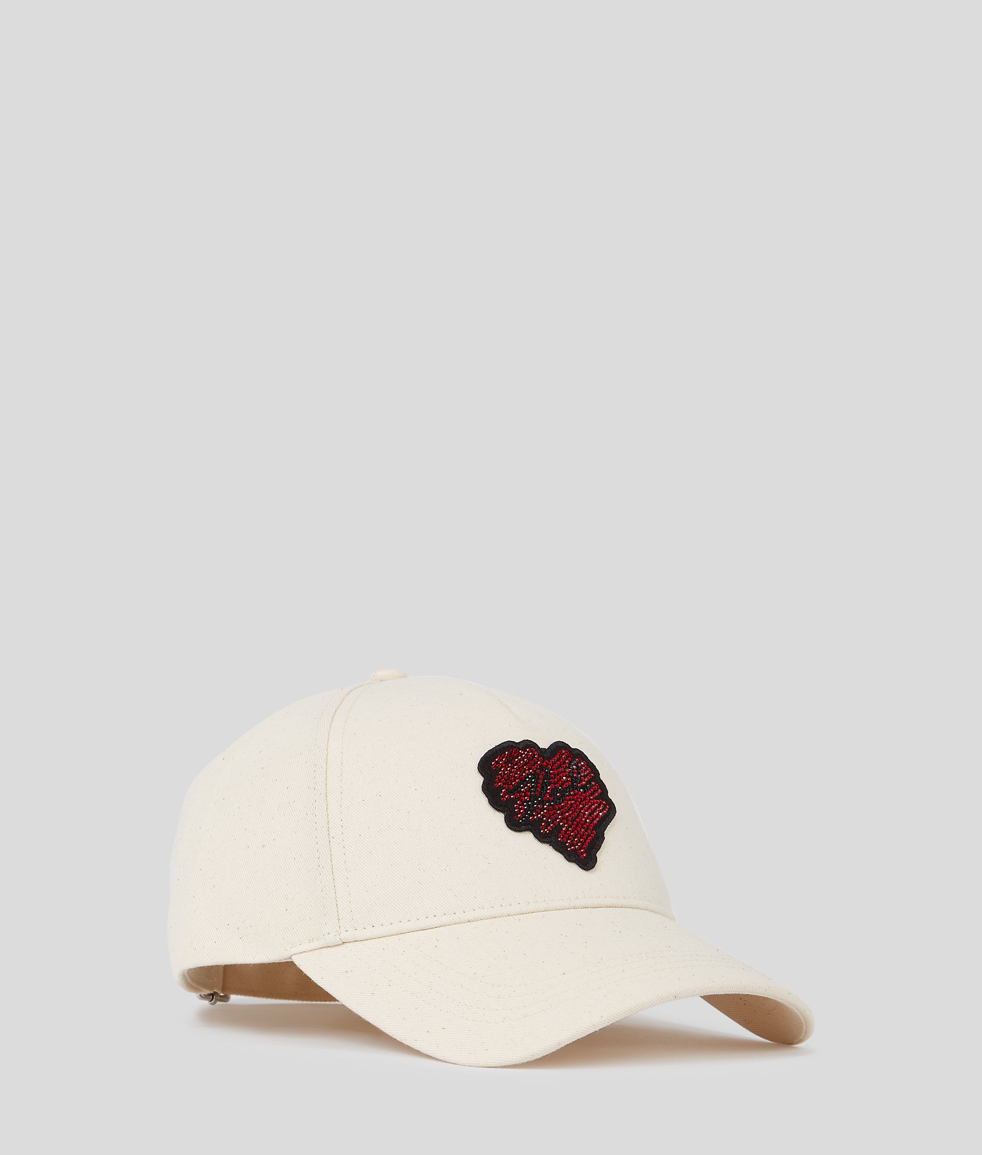 A shimmering rhinestone heart with a scribble-effect KARL Signature logo adorn this classic cap. embodying a charming blend of style and whimsy. An ideal gift for someone special.