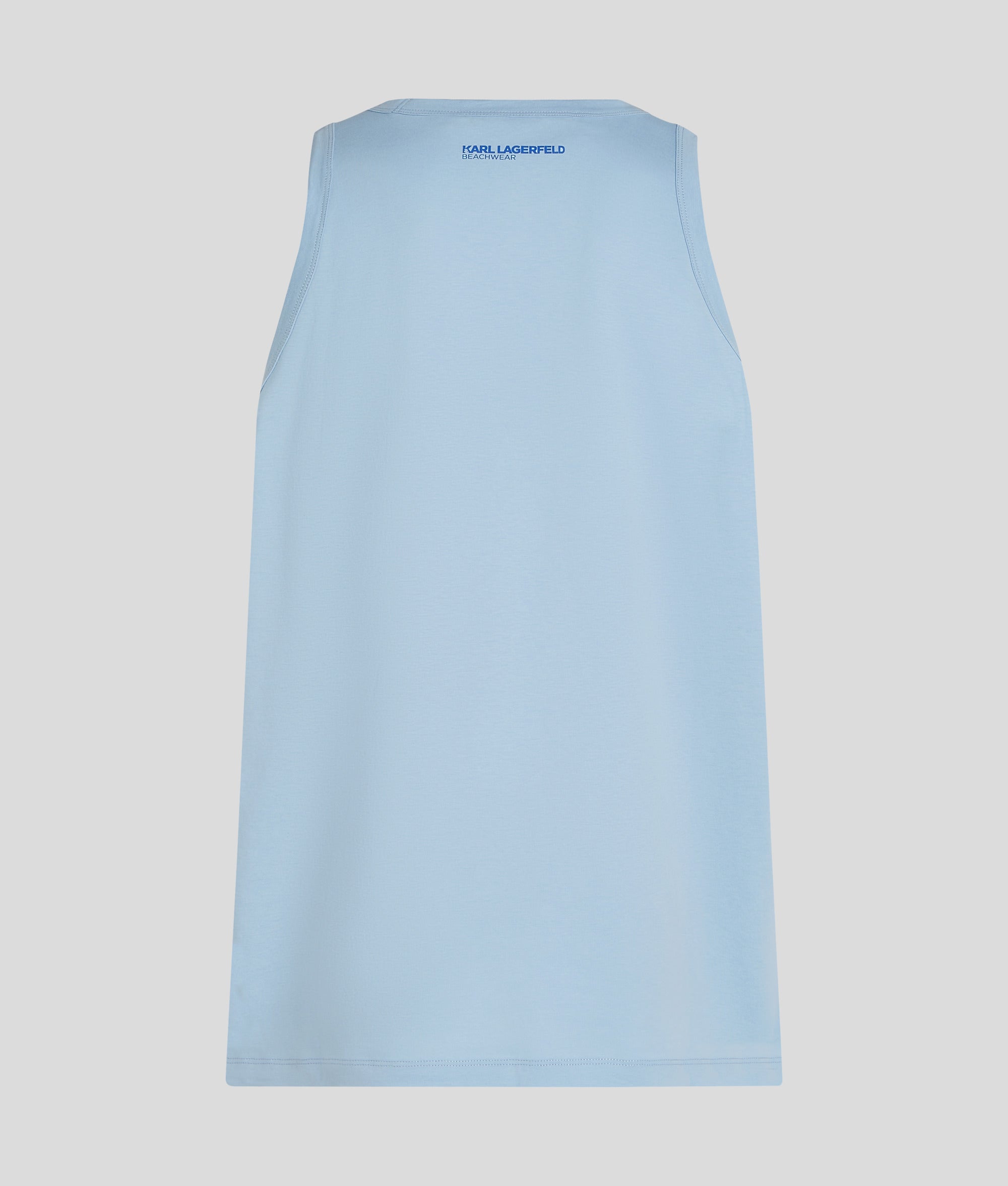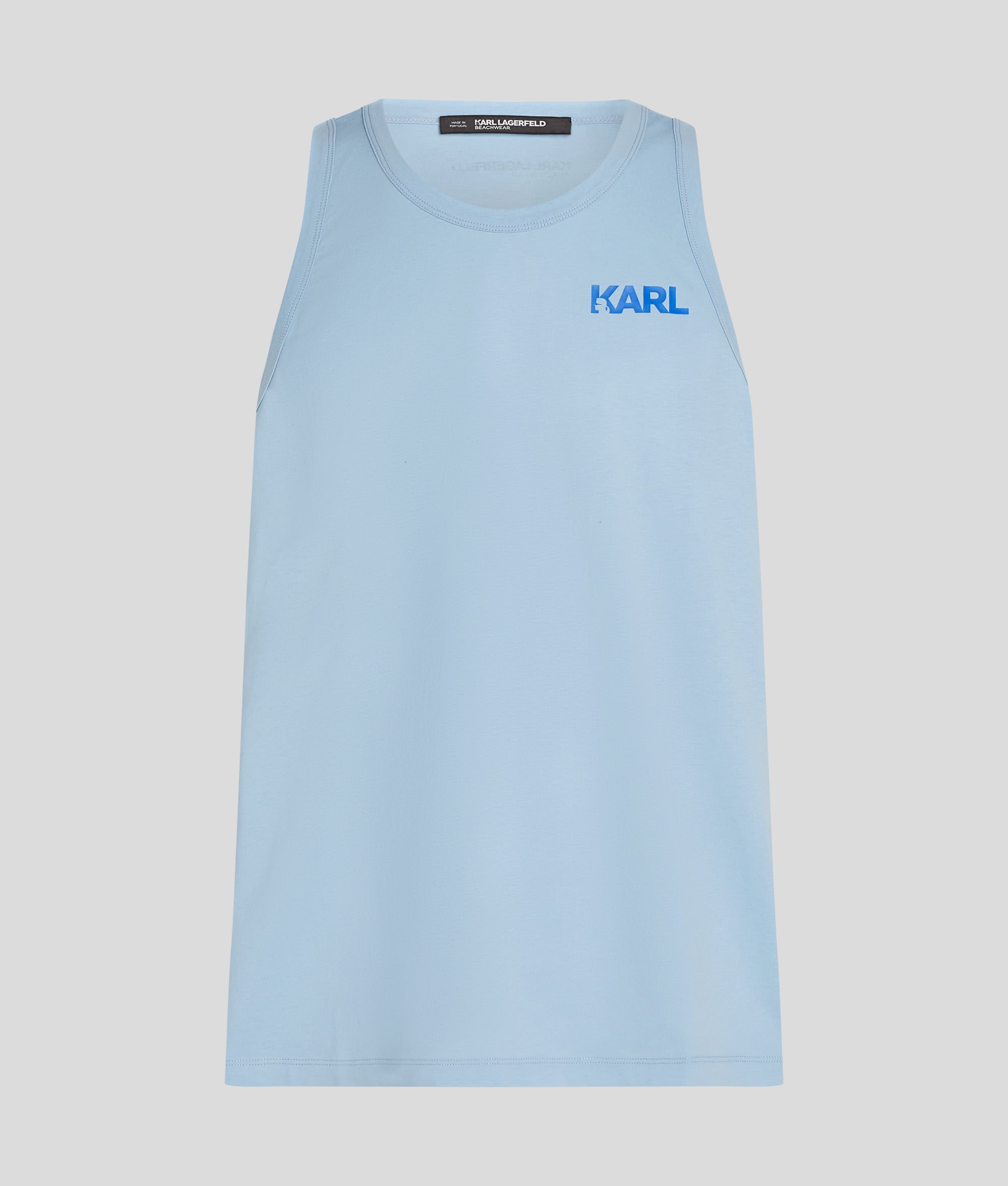 An ultra-lightweight beach tank top featuring a comfortable sleeveless design and a classic crew neck. The prominent KARL logo at the chest adds a statement touch. perfect for sunny days by the water.