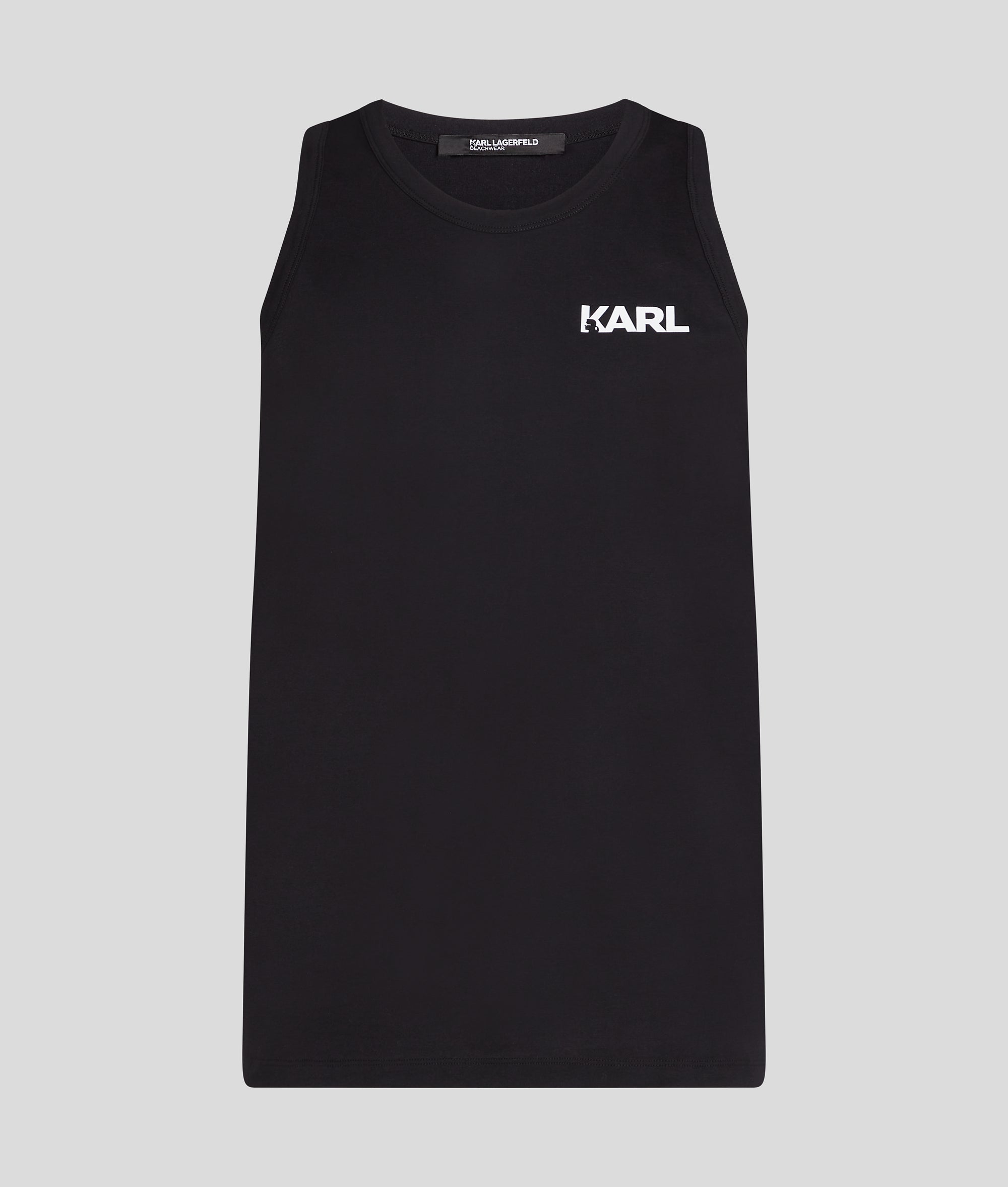 An ultra-lightweight beach tank top featuring a comfortable sleeveless design and a classic crew neck. The prominent KARL logo at the chest adds a statement touch. perfect for sunny days by the water.
