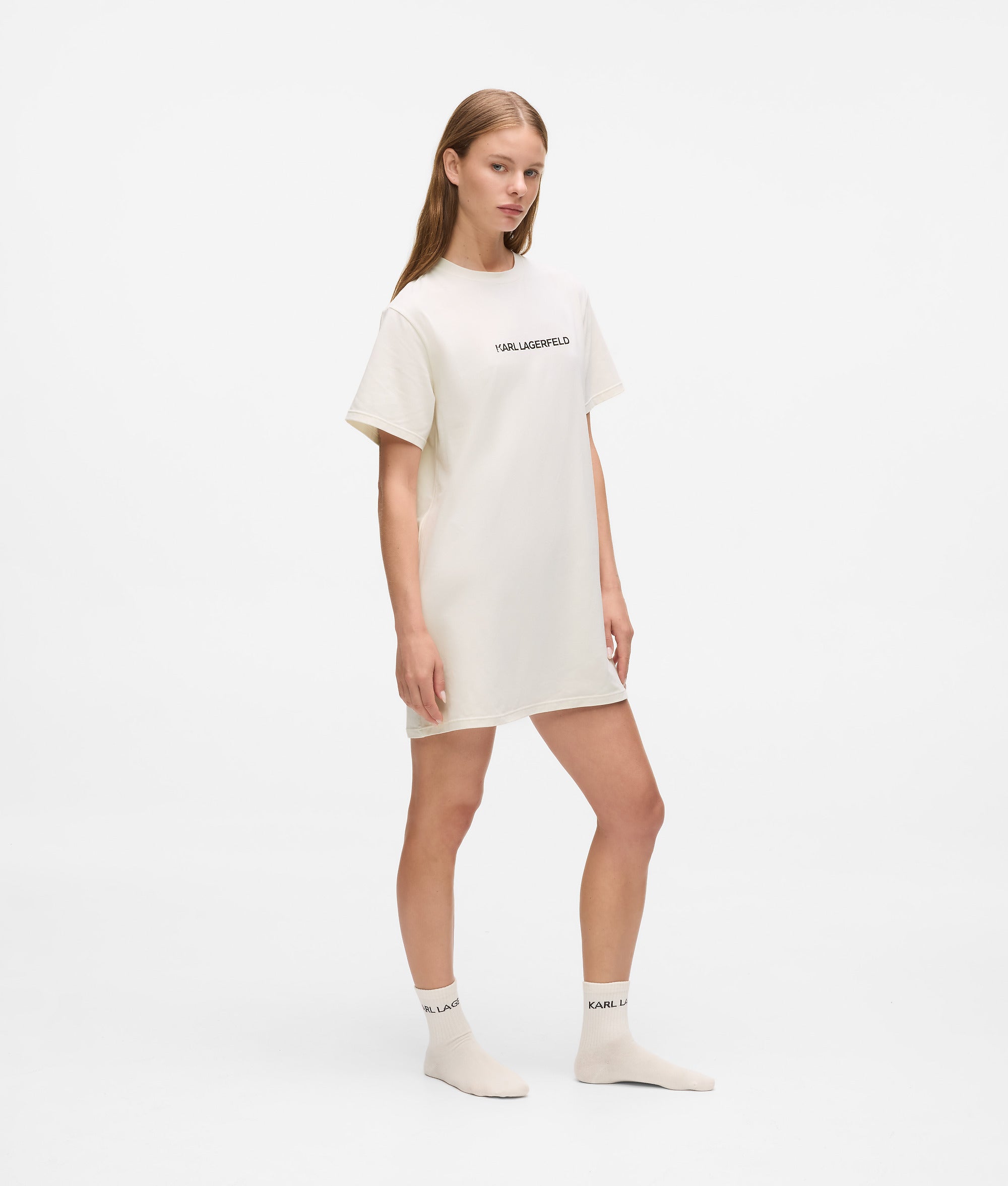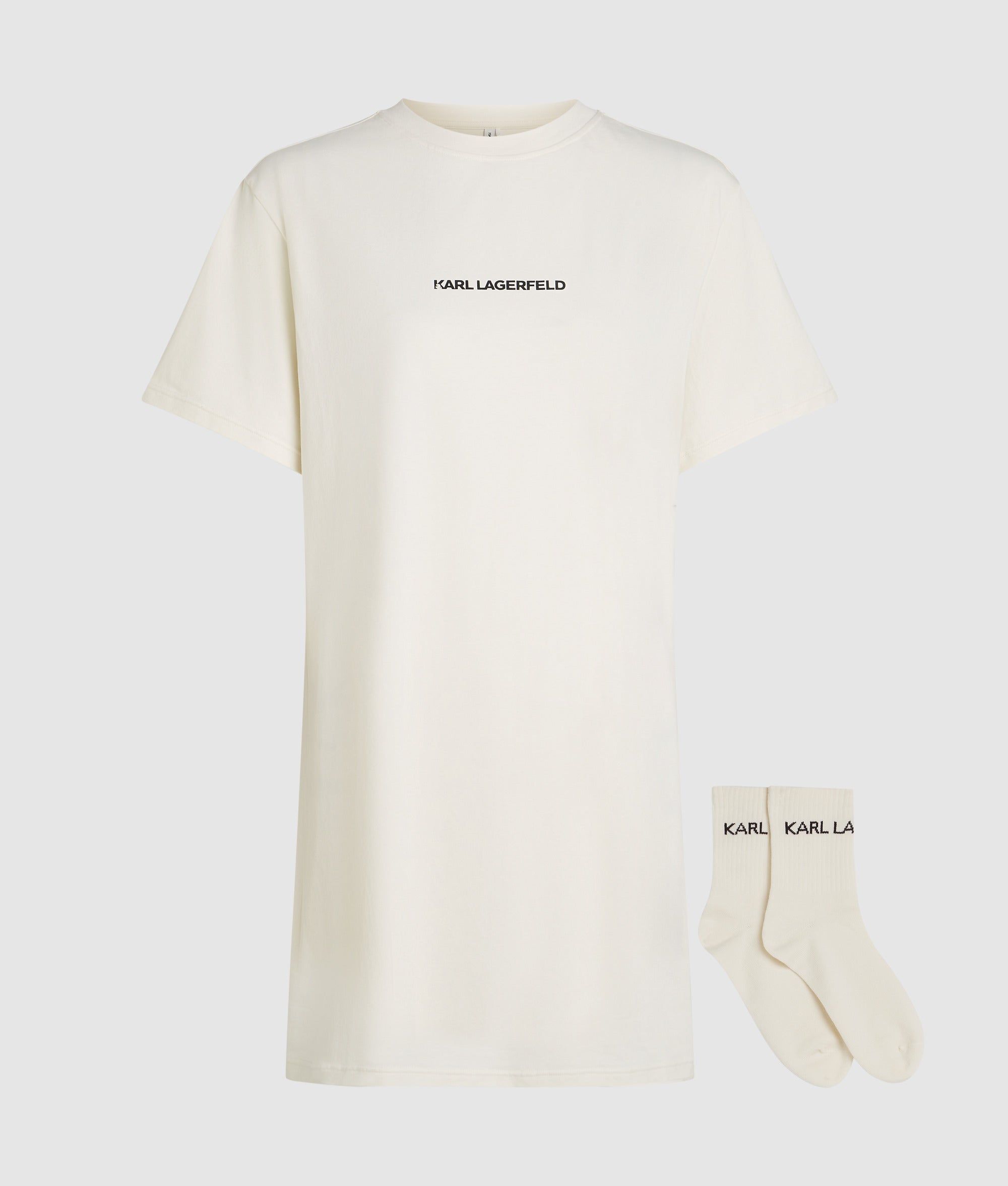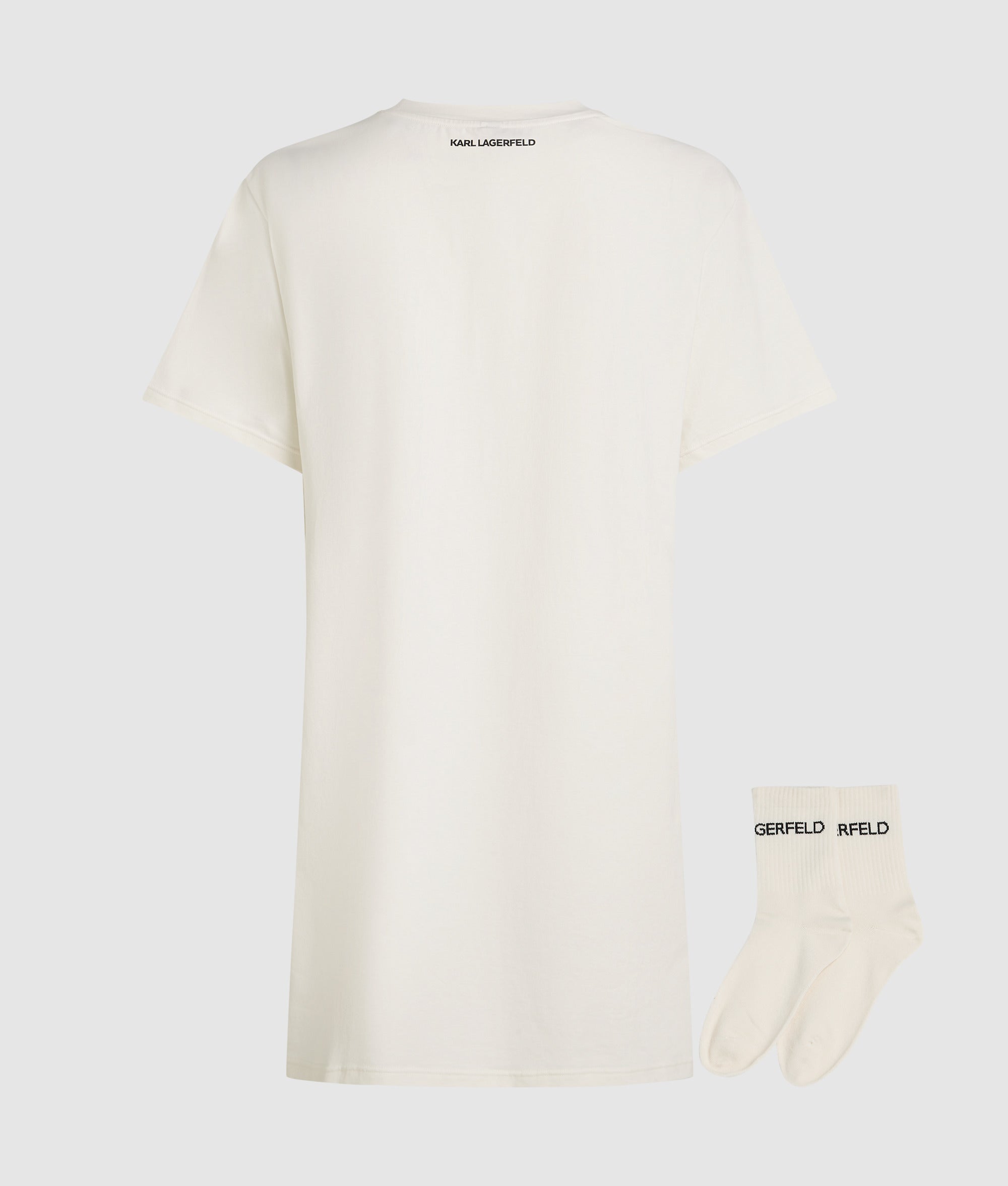 Chic. comfortable and ready to gift. This pajama set features a relaxed T-shirt dress and matching socks. both adorned with the unmistakable Karl Lagerfeld logo.?