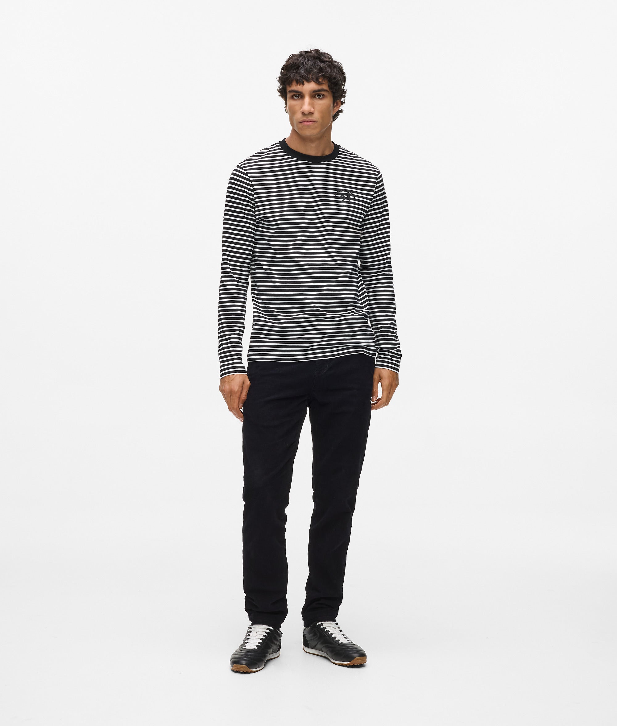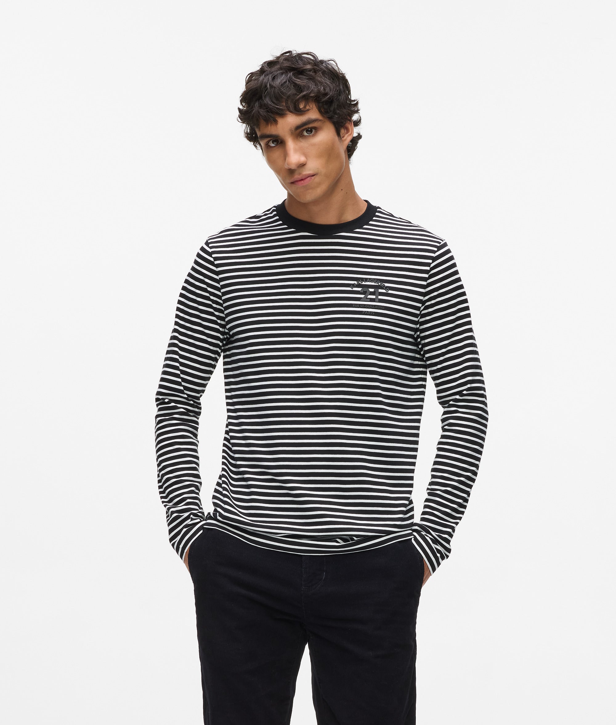 This long-sleeved T-shirt features a bold striped pattern and a standout 3D logo on the chest. The classic crew neck with contrasting piping adds a touch of refined street style.
