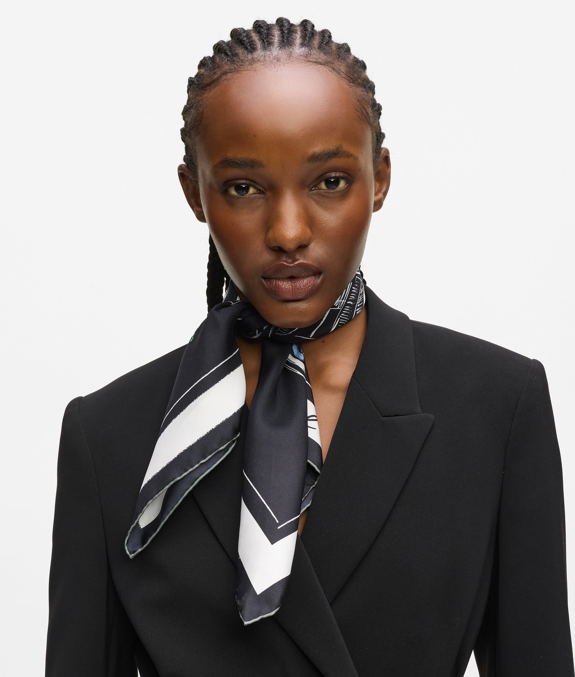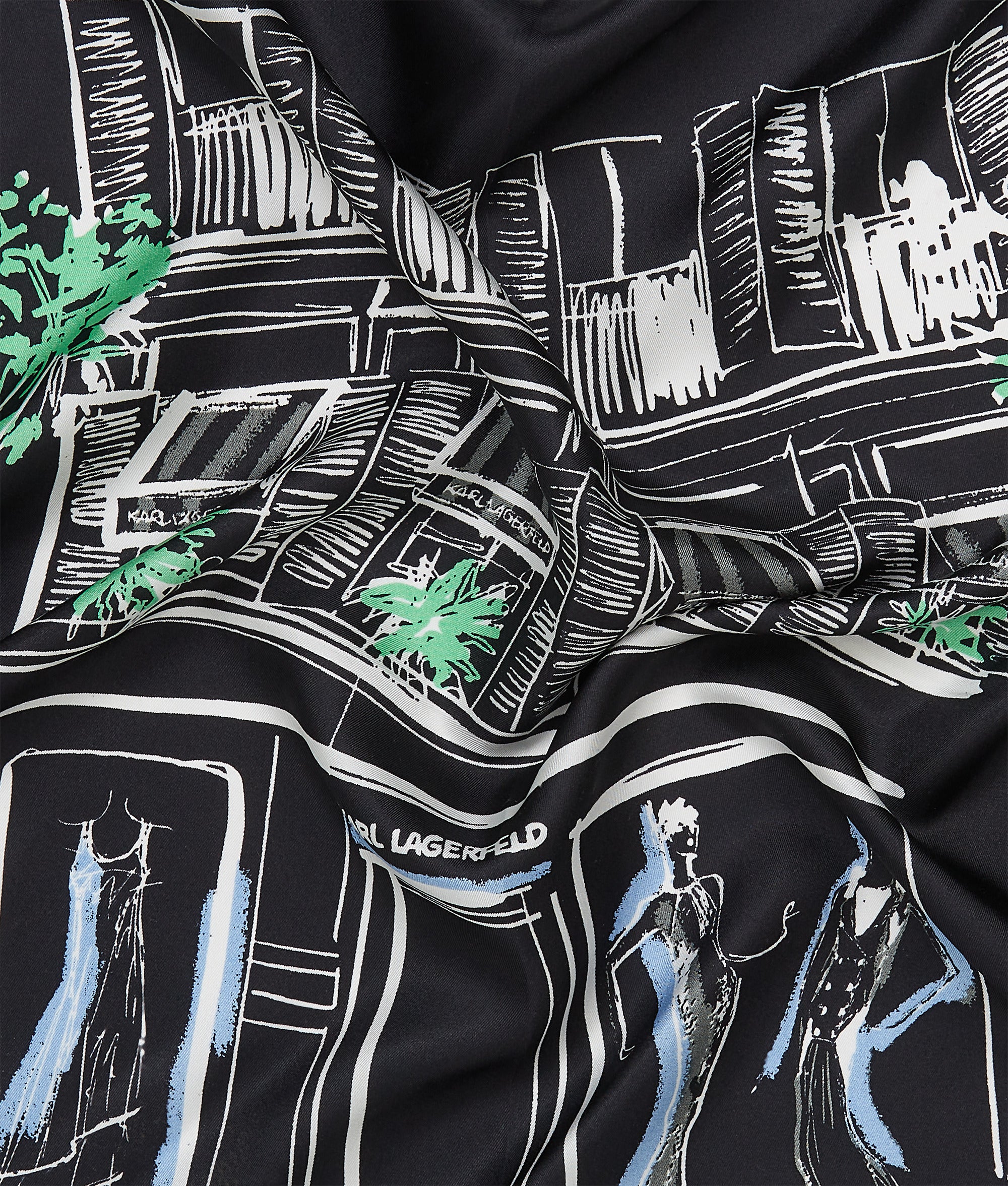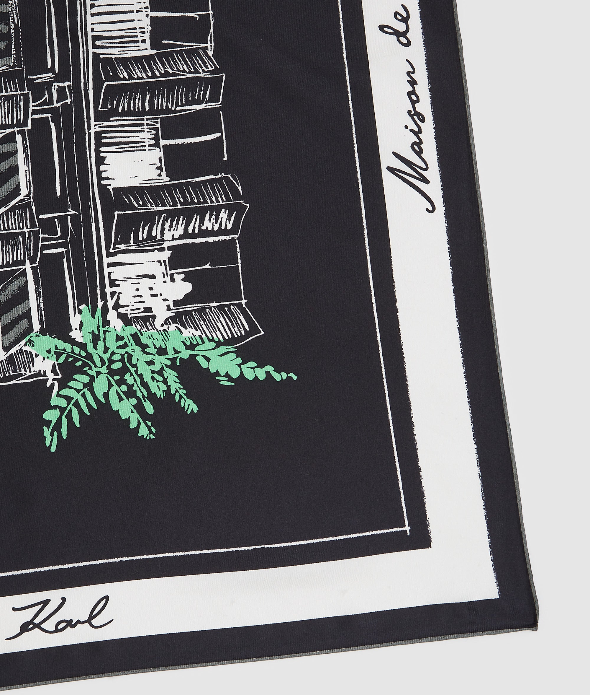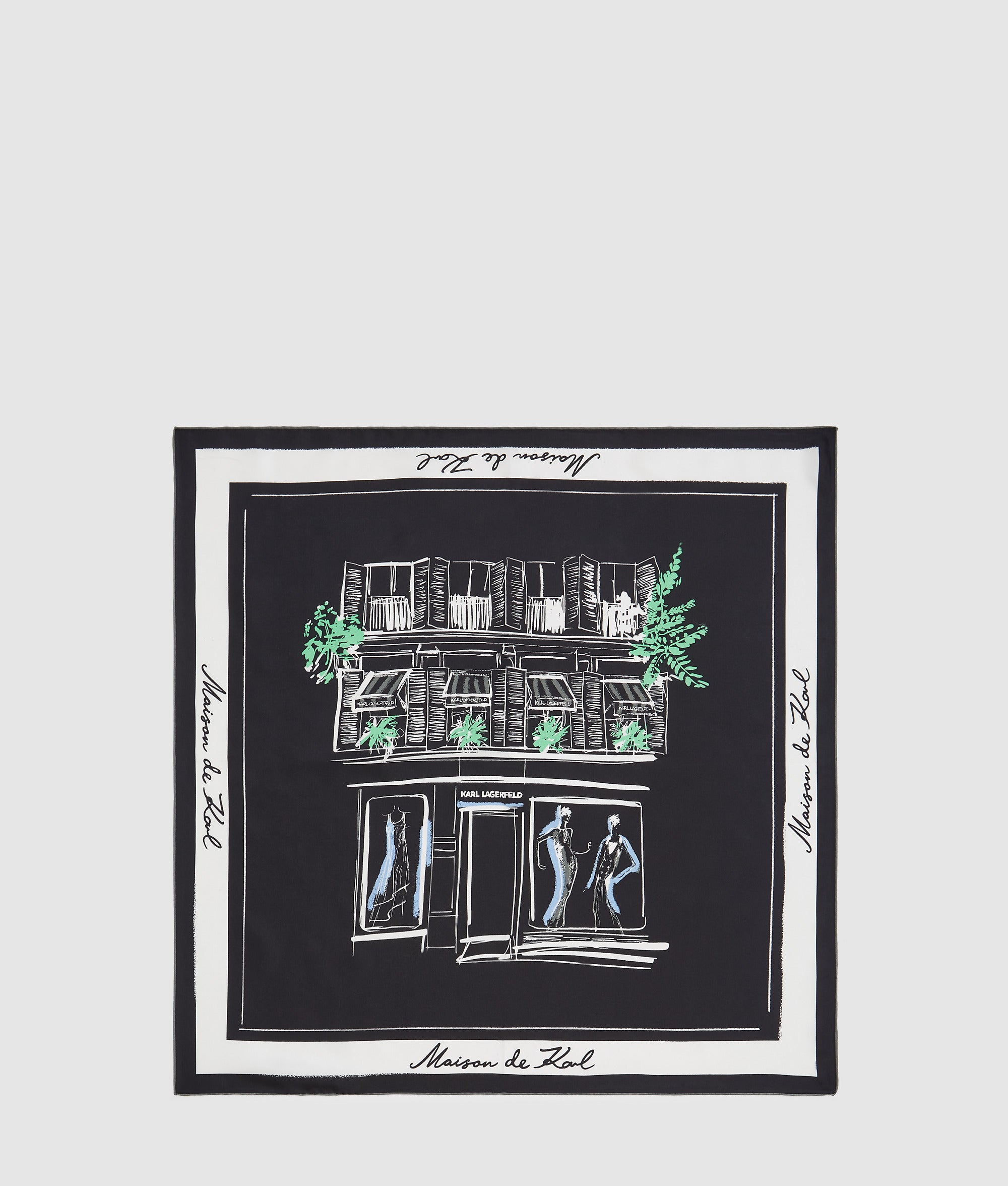 A square silk scarf featuring Maison de Karl artwork and a contrasting logo border. blending artistic flair with refined style in a versatile accessory.