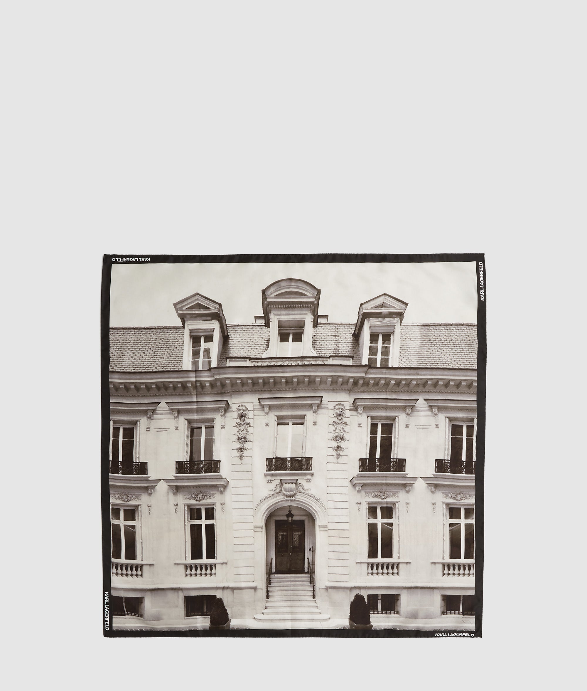 An elegant silk scarf featuring artwork inspired by the iconic Maison de Karl in Paris.