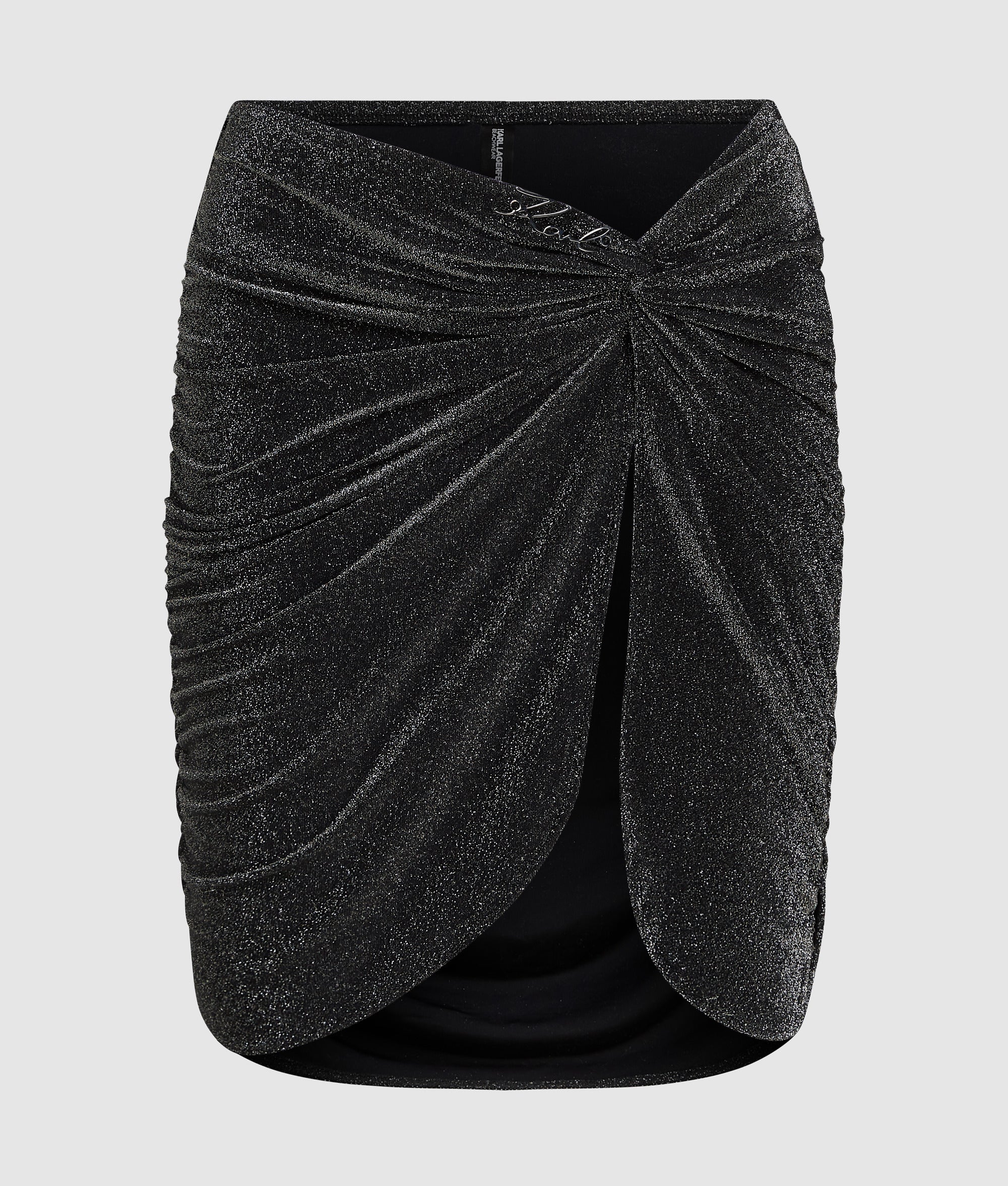 This metallic beach skirt shimmers with every step. Draped side seams sculpt your silhouette. and a knot-detail with Signature logo hardware adds a touch of polished allure.