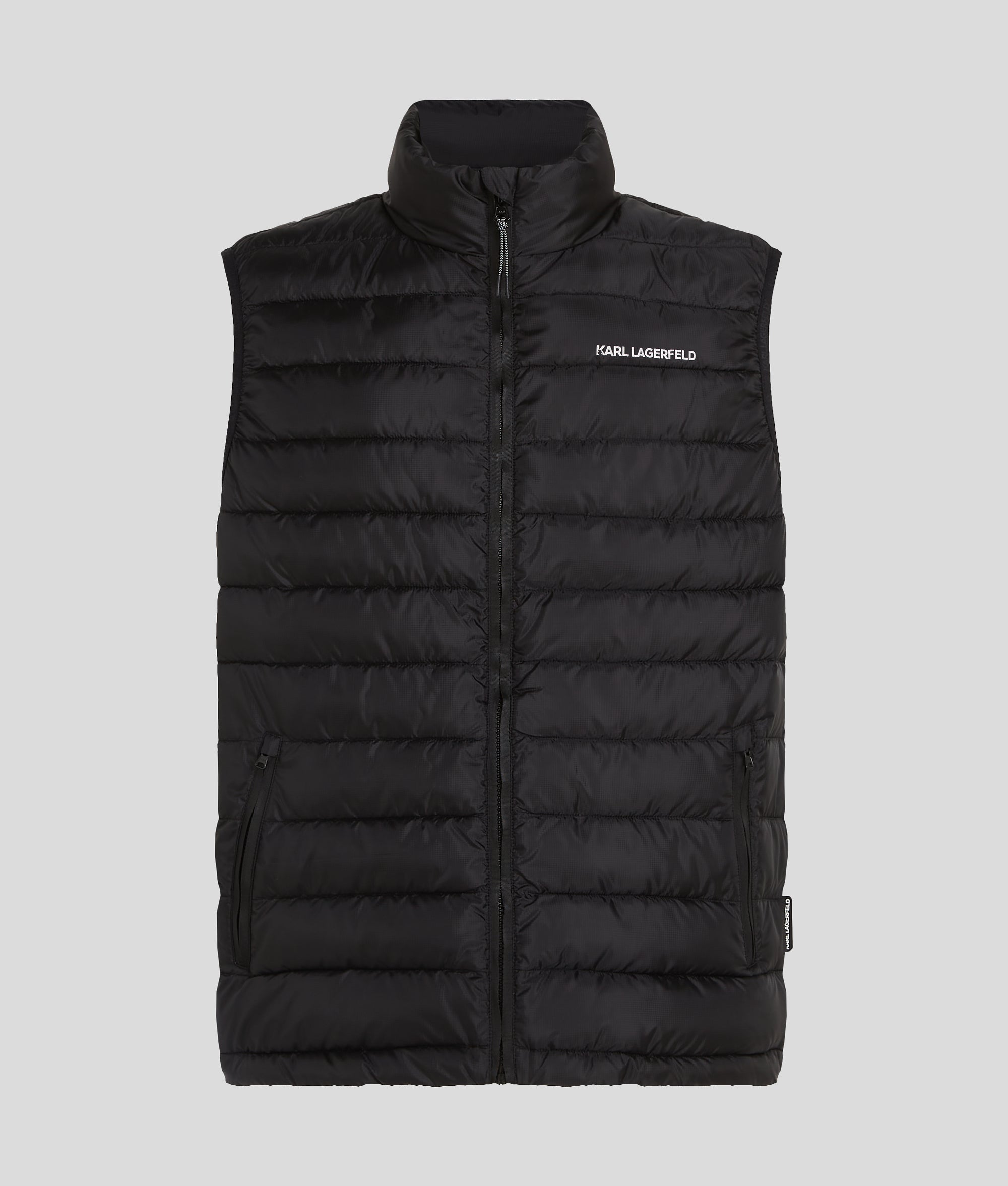 This quilted KARL LAGERFELD gilet combines style with practicality. Its lightweight fabric offers sophisticated comfort. while the stand-up collar adds a poised touch. For modern utility. zipped pockets ensure essentials are secure and at hand.