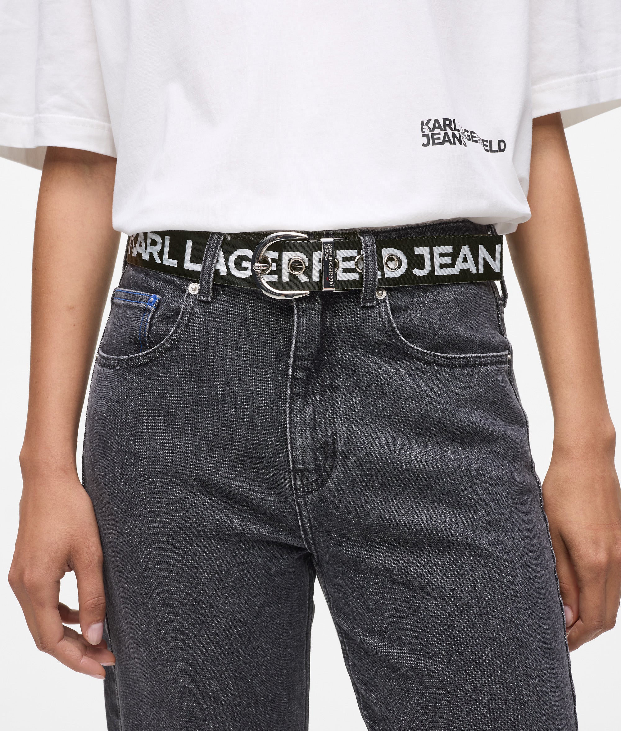 Unlock versatile styling with this two-tone reversible belt. Featuring a rounded metal buckle and bold eyelets. it showcases the KARL LAGERFELD JEANS logo along its length. making it a standout accessory for any outfit.