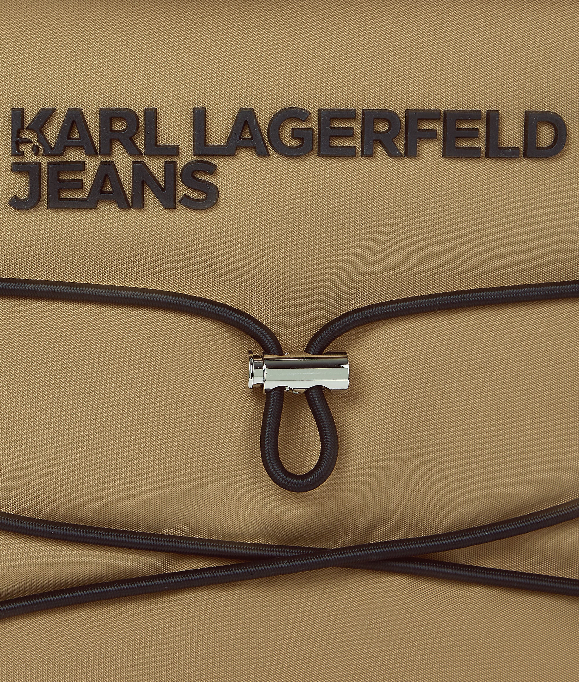 A utility-inspired backpack. featuring a roll-top closure with a secure zip and contemporary buckle accents. Mesh pockets and edgy drawstring detailing add an adventurous flair. complemented by the KARL LAGERFELD JEANS logo.